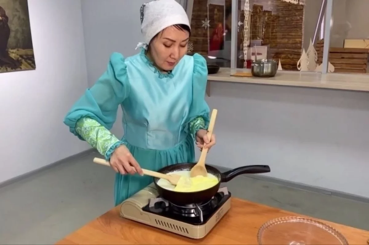 «И, как только вы видите, что пенка молока появляется, густая, потому что надо брать молоко с высокой жирностью, снимаем её аккуратно», — рассказала, представляя рецепт урумэ, сотрудница музея Туяра Павлова.