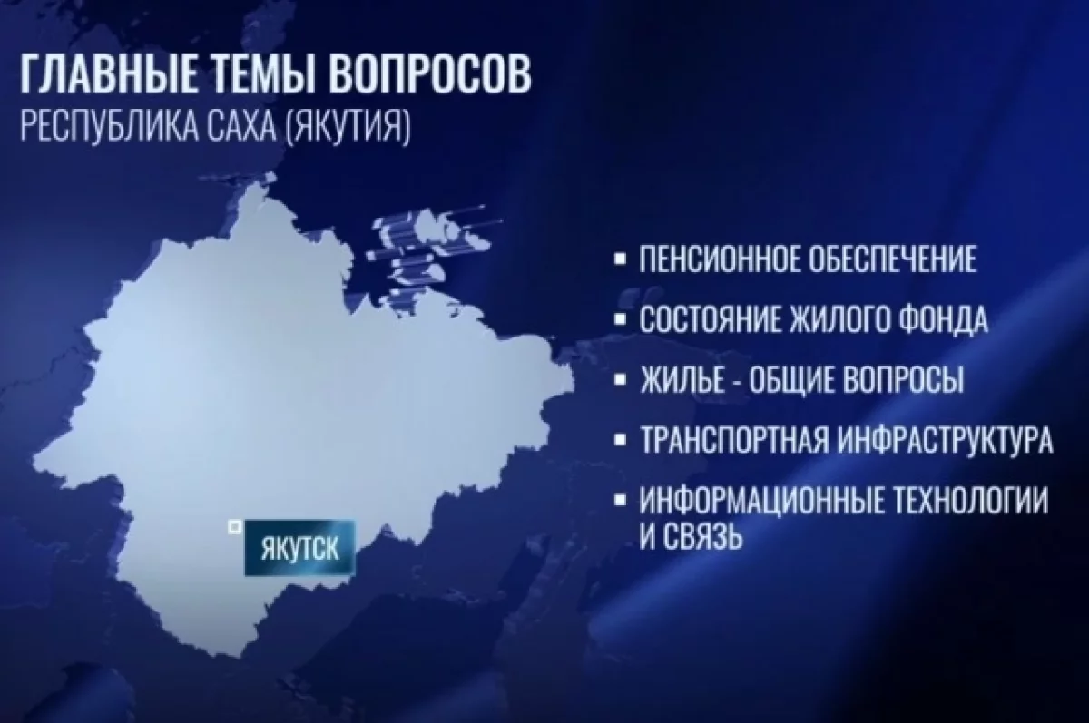 Главные вопросы, которые задавали Владимиру Путину жители Якутии, касались следующих тем: пенсионное обеспечение, состояние жилого фонда, общие вопросы, касающиеся жилья, транспортная инфраструктура, а также информационные технологии и связь.