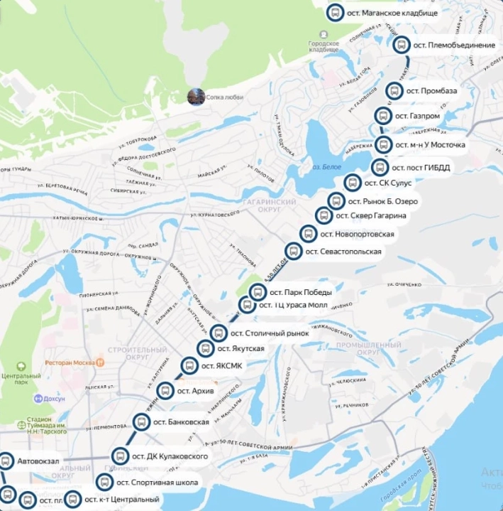 «Схема движения автобусного маршрута № 119: Автовокзал — улица Октябрьская — проспект Ленина — улица Дзержинского — Автострада 50 лет Октября — улица Можайского — Маганский тракт. Остановки — по всему пути следования», — сообщает пресс-служба.